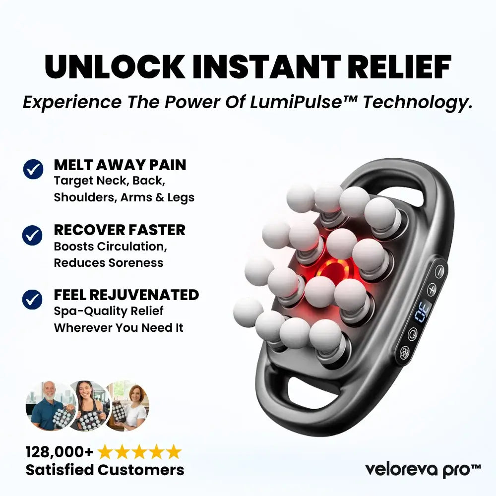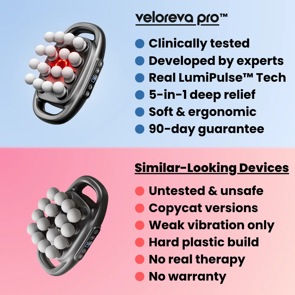 The Veloreva Pro™ uses deep massage and gentle vibration to loosen up tight spots that have built up over time. The red light goes a bit deeper, it helps warm the muscles and get blood flowing again, so they can finally relax instead of fighting against you all day.