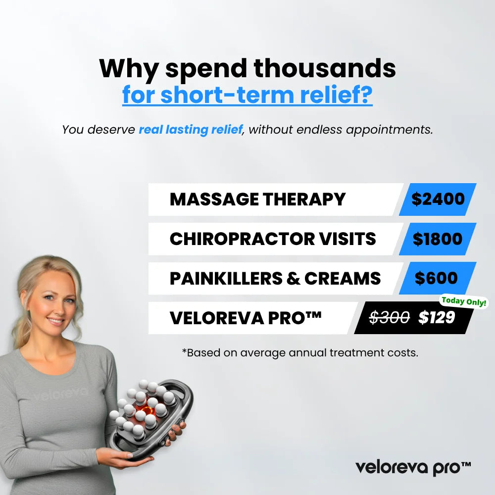 At the standard 5–7 weekly visits, that’s well over $2,000 for the same relief you can now get at home for under $150 with Veloreva Pro™.