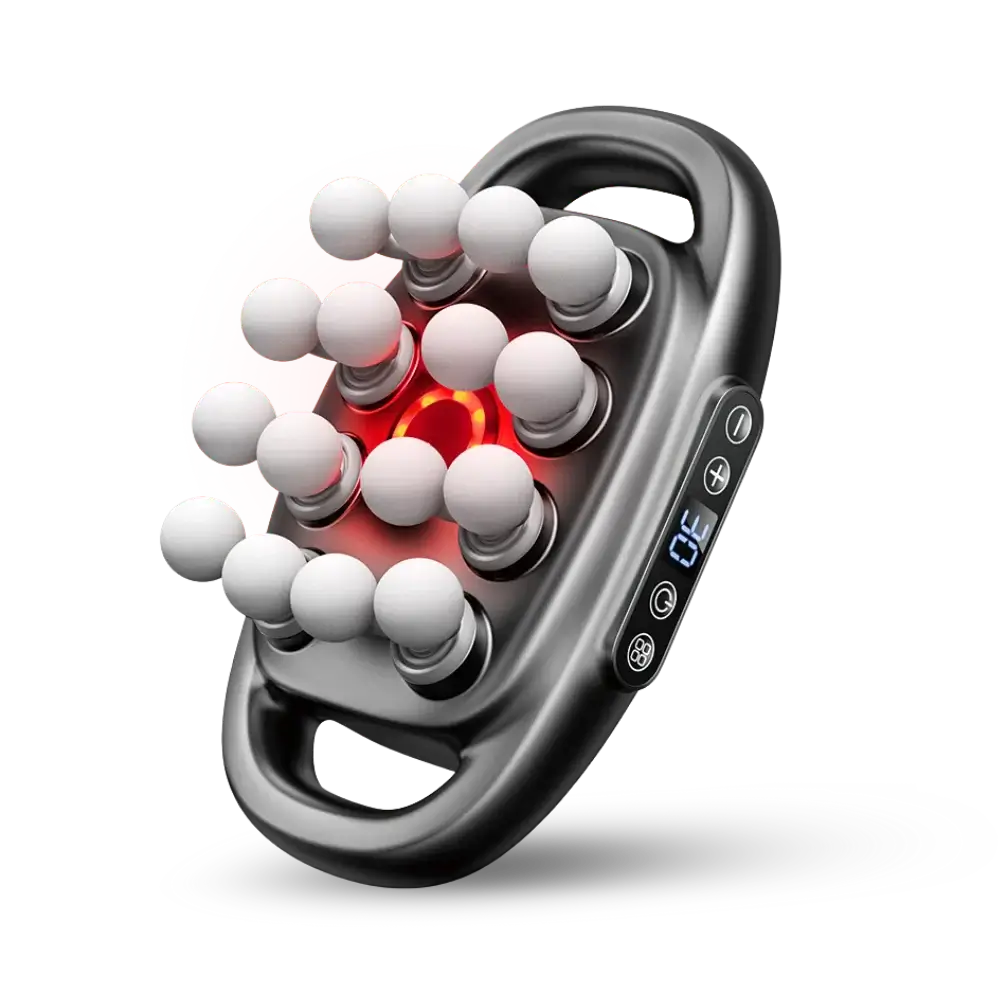 LumiPulse™ emits 660nm Red Light to gently warm muscle tissue before impact. This prevents the body's natural "flinch response," allowing the massage heads to penetrate 40% deeper without pain. It floods the area with oxygen-rich blood to melt rigid fascia and break up knots, rather than just masking them.